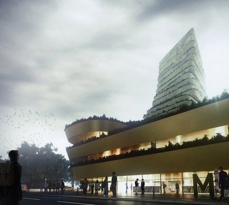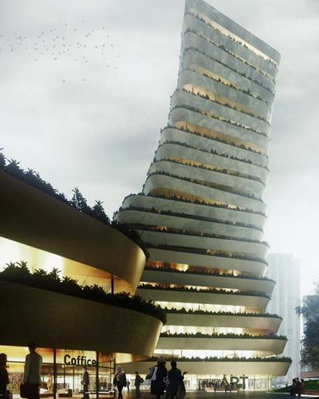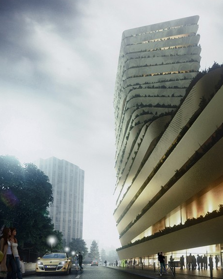 位于斯洛文尼亞采列古城中心,廢棄的場地并非直接相鄰歷史建筑,但有一個相當復雜的高海拔小面積的周圍環境。設計師希望給這片區域創建一個邏輯,使各種類型建筑組合在一起。該建筑由一系列堆疊的層面或推或拉地疊放在一起,好像是在對周圍的現有空間做出回應。塔分為三個大層,低水平在南面反映出高度的獨立住宅的,在底層形成一個活躍的臨街公共設施,和街區一起形成了一個新的開放廣場。西部逐漸向上升起,變成一系列的陽臺,最終到達周邊建筑的高度。建筑正面展開朝向相鄰的大公園,有良好的觀景角度。水平梯田線的外觀結構模糊了劃分部分之間的轉換。設計特別注意幫助集成現有的人行道,引導行人到市中心、廣場和徑 savinja河。一條綠帶也沿著建筑邊緣,形成了一個歷史去的框架。