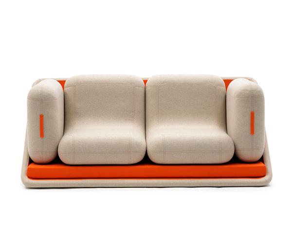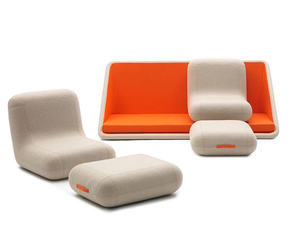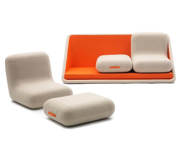 這是一款設計簡單的橘色創意模塊沙發,操作那就更簡單了,根據自己的喜好和使用的場合,對沙發模塊的組合,只是簡單的挪個位置而已。此沙發有一個主體的框組件,還有2個L形和矩形的靠墊。它們可以是腳凳、扶手和單體沙發,組合還可以是單人床。