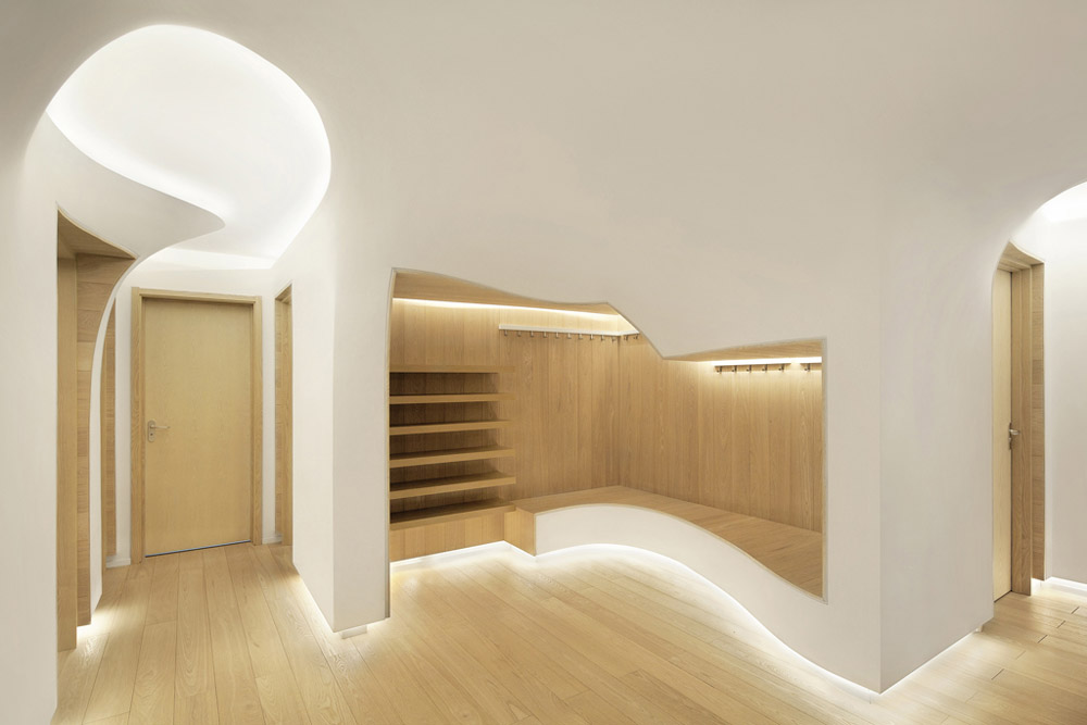 “雪屋”的設計中設計師從融化的雪的形態中找到靈感,將自然優美的曲線應用于室內空間形態設計中,白色的曲面把墻面和頂面聯系成一個整體,