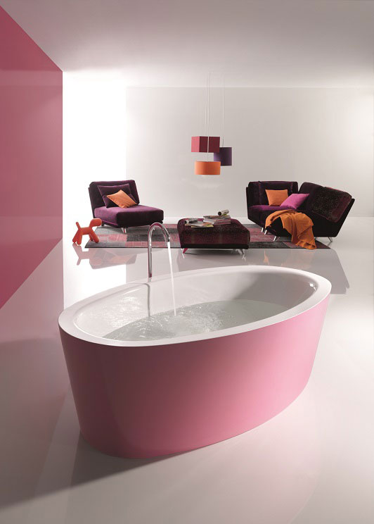 在純白與濃烈色彩的交匯處,百諦(BETTE)衛(wèi)浴的設(shè)計(jì)師們再次巧妙地為我們的視覺預(yù)設(shè)了小小的騙局。任何一位輕移指尖、企圖在紫羅蘭色浴缸邊緣尋找色彩接縫的女士,都將驚喜地發(fā)現(xiàn):BICOLOUR系列浴缸雙色交界的邊沿根本無隙可尋??瓷先ソ厝徊煌脑「装咨珒?nèi)面與彩色外立面,似乎將產(chǎn)品形象地分割成了內(nèi)外兩面,但實(shí)際上,兩種色彩完全天衣無縫地融合為了一體。