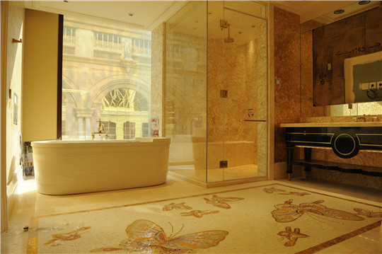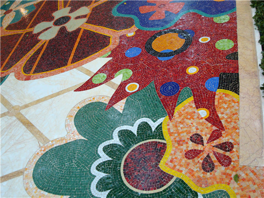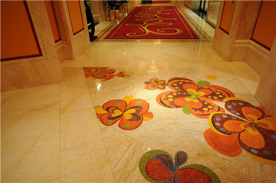 1、永利酒店的地面裝飾設(shè)計(jì)采用了馬賽克裝飾。先將不同顏色的石材分割成不同形狀的馬賽克小顆粒,并依照設(shè)計(jì)圖紙進(jìn)行拼接,色彩與形狀錯(cuò)落有序的層疊開(kāi)來(lái),似一只只飛舞的蝴蝶綻放在金蜘蛛的海洋里。