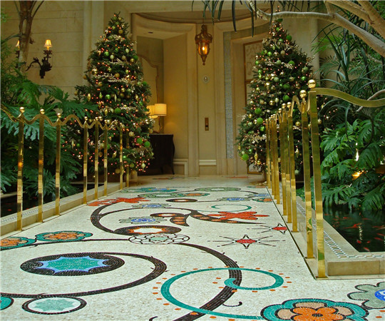 2、美國(guó)拉斯維加斯WYNN酒店,是全世界造價(jià)最貴的復(fù)合式度假酒店。其中地面的馬賽克拼花設(shè)計(jì)是酒店的一大亮點(diǎn),繽紛多彩的石材顏色搭配出絢麗的圖案,為酒店增添了濃厚的浪漫色彩。