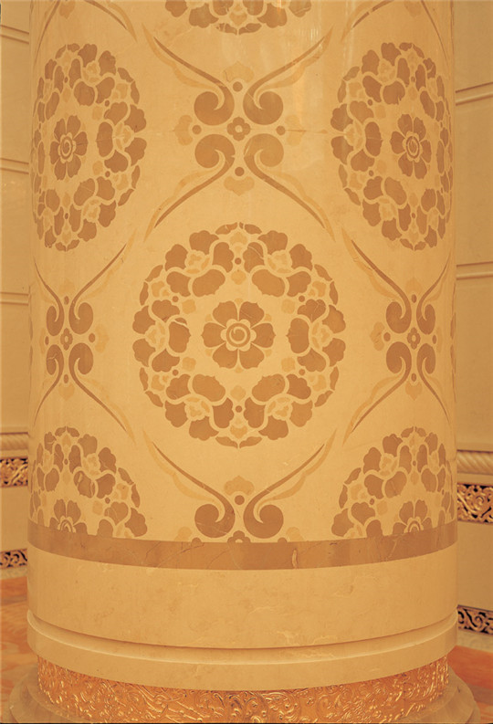 4、環(huán)球石材集團(tuán)經(jīng)過(guò)反復(fù)研究,突破了水刀拼花圓柱的工藝制作難題,使拼花由平面拼花發(fā)展到立體拼花,開(kāi)創(chuàng)了水刀拼花圓柱工藝的先河。其中有8條芙蓉花水刀拼花圓柱,一條圓柱拼花零件就達(dá)6250個(gè)。