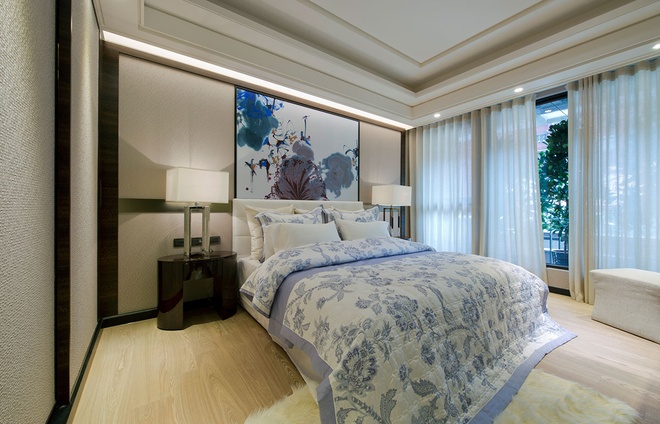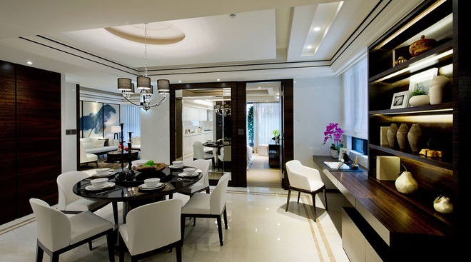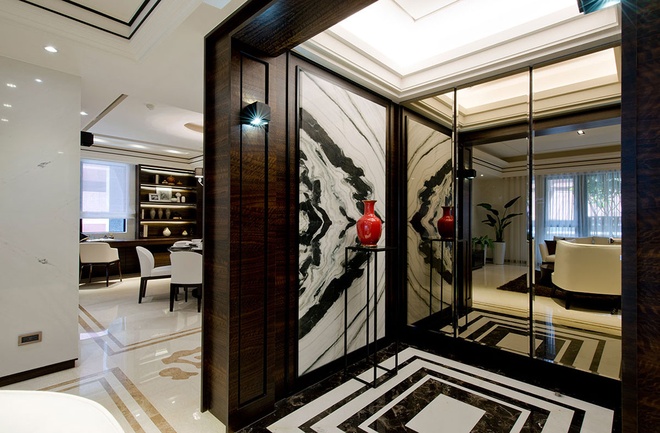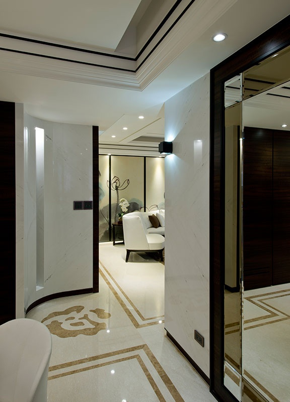 漸層內縮的黑白方框地坪,與水波紋向外擴散的端景墻線條,在鞋柜門片的鏡射倒影中,放大玄關尺度,IS國際設計將擅長的石材藝術帶入公共空間,紋理細致的白色大理石墻包圍客廳立面,藉此放大電視墻器度,延伸線條收在水墨蓮荷的訂制畫作前,形塑藝文優雅氣息。設計師并依循天花梁體處的黑色描邊線條,在地坪處框以相同金色飾帶與之呼應,并同樣施作在餐廚區。隱藏在深色楓木水波木皮起伏線條內的私領域,加入木地板與高級壁布元素,場域的轉圈,也藉由材質與色彩的跳接,有了公私領域不同的變化。