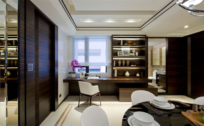 除了材質的精巧鋪排外,設計師也透過柜體與廚具的安排,修飾結構柱體的存在,增加收納機能,并在空間軸心的餐廳,將通往各機能領域的動線,隱藏在相同的立面語匯里,另在窗邊增設一處閱讀展示區,構筑方整干凈的設計框架,在主從關系間,定義家的設計層次。