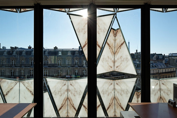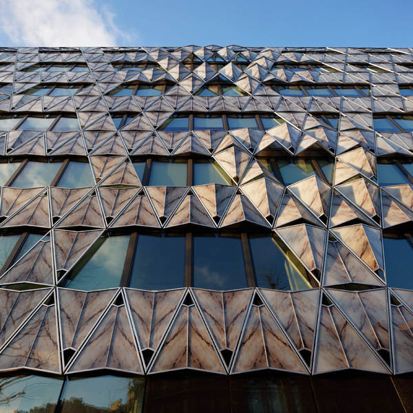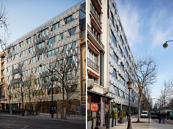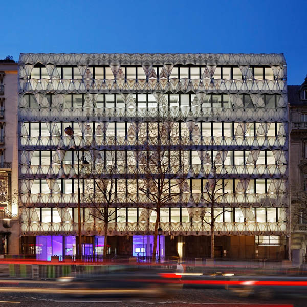 浪漫的香榭麗舍大街,偉岸的凱旋門,而就在這樣一個散發著古典氣息的街區,極富視覺沖擊力的“折紙大樓(Origami Building)”便坐落于此,大理石效果的外墻下是巴克萊銀行(Barclays)設在巴黎的總部辦公室。建筑師 Manuelle Gautrand 引入棱角分明“折紙”元素:以三角形的大理石板,在臨街立面搭建起外墻裝飾,讓原本厚重的大理石如折紙般輕盈。