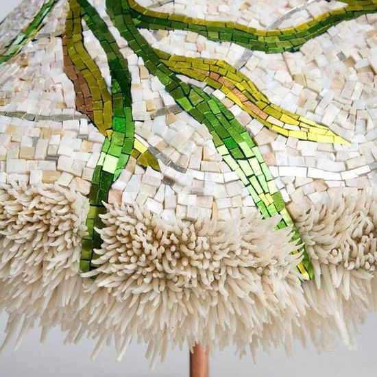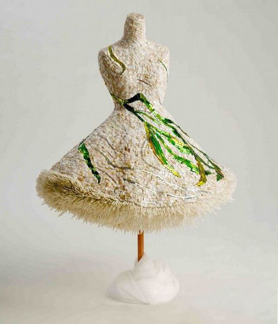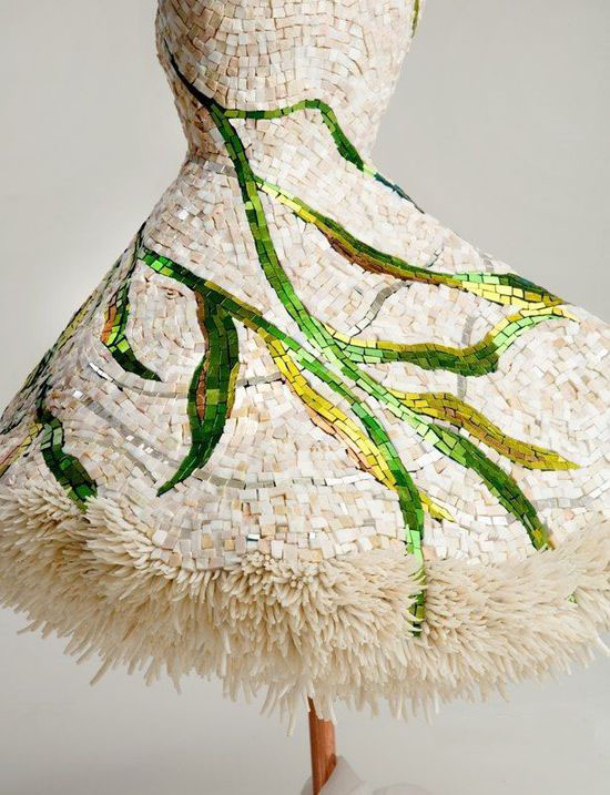 這條白色飾有綠色花紋的禮裙由大理石、玻璃馬賽克、鍍金馬賽克、玉髓及貝殼制作而成,講述了一個關于發生在墨西哥灣的美好事物消逝的故事,蔓延在裙子上的亞洲綠海帶實際上是一種墨西哥灣的入侵物種,它們對貝殼的生存環境造成了極大的影響。