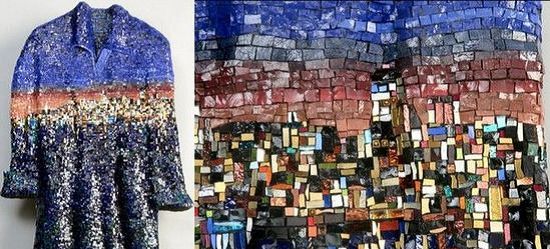 另一條以藍綠色為主色調的長衫,則是藝術家試圖表現某一次開車到海灣對面的公園景點,身處寧靜海灣遠眺對面人潮洶涌的舊金山城的感受,那份安寧與喧囂的巨大反差給了藝術家難忘的心靈震撼。