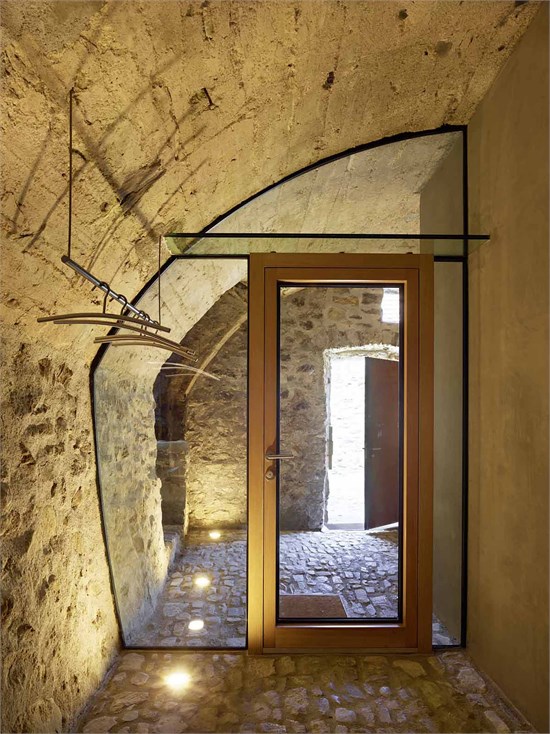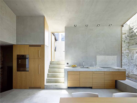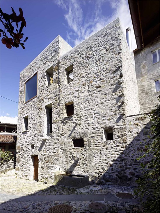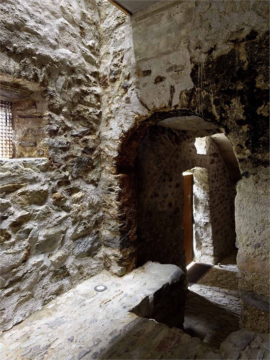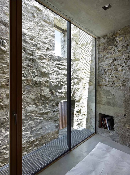 Wespi de Meuron Romeo建筑事務所在接手這個項目的時候被告知,在項目進行時需謹遵一些準則。最初的建筑體必須保留,而且在保留建筑體的同時,還要保持房屋散發出來的極其堅固的感覺。為達到這一目的,建筑師將木梁地板換成了水泥地面,這樣有利于加固舊墻。在上層立面區域內腐爛的木構件用鋼筋混凝土墻代替,同時保持了原有的形式。原有開口內安裝了與內墻表面齊平的新窗戶。建筑師還嵌入了額外的大規格開口,一邊鎖定風景,并將光線引入房間中。這些窗子與外墻表面齊平,所以不會破壞原有建筑體系。多空石墻的裂縫用水泥密封,缺失的石塊也進行了替換。在主樓,木梁結構的斜屋頂嵌入石墻,同時還有一個天然石材鋪成的屋頂露臺。這個改造項目的主要構思是開拓出石墻的力量,并展現這座古老建筑樸素的一面。所以拆除了外面的石梯,還原屋前的小空地,自然還有一個噴泉和一張長凳。