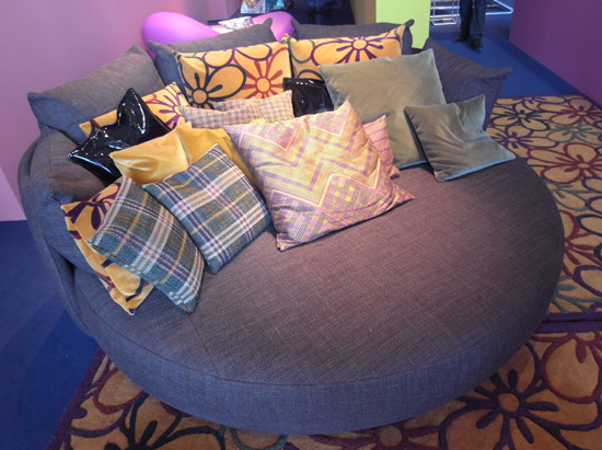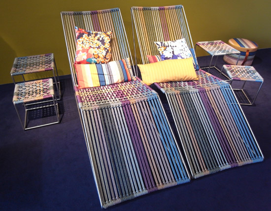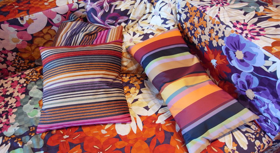 以家居飾品類產品為主的MISSONIHOME延續了MISSONI的設計理念,仍然以幾何抽象圖案和多彩條紋為絕對主 題,又根據其服務于室內空間的特點作了相應調整,加入了空間概念。RositaMissoni把MISSONIHOME的核心主題概括為“space-dye”,即“用多種多樣的絢麗色彩取代純色,配合著奇妙的抽象幾何圖案創造出持續不斷的變化,產生令人驚艷的視覺效果。”MISSONIHOME的“色點”形式豐富,水平線、垂直線、鋸齒線,波浪線、小方格、多色方格、圓點……等等,它們和各種各樣的色彩一起構成了“MISSONI組合游戲”。游戲方式如同拼一幅拼圖,圖案、色彩和材料等元素就像用來混合、移動和改變的圖塊。這是一個永恒的練習場,新產品在不斷地打散重構中誕生,色彩的空間之舞無窮無盡。