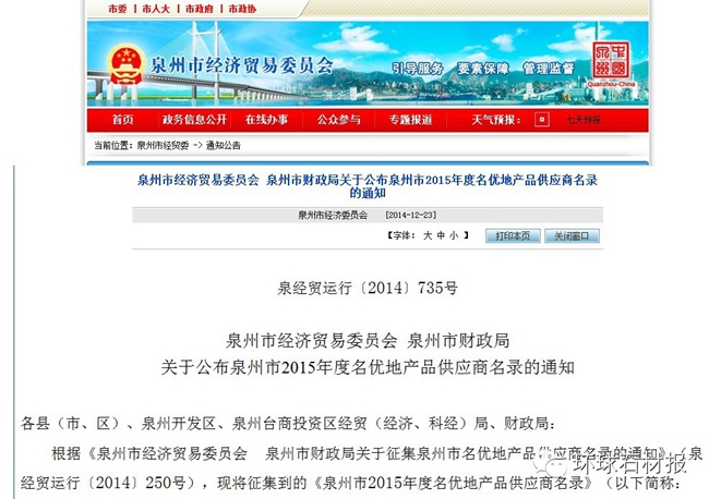 本報訊 本報記者龍會剛 通訊員福建公司周松喜 近日,《泉州市經濟貿易委員會 泉州市財政局關于公布泉州市2015年度名優地產品供應商名錄的通知》發布,環球石材入選福建省泉州市2015年度名優地產品供應商名錄。
