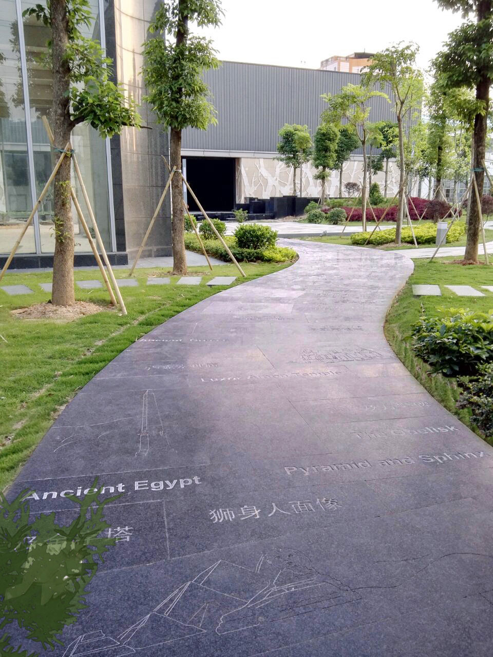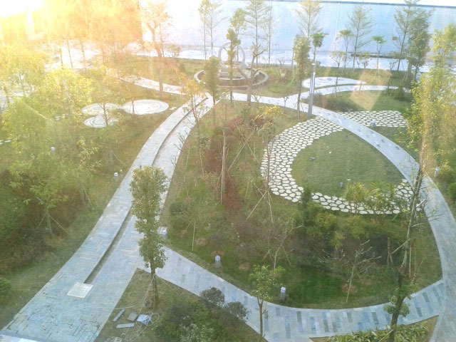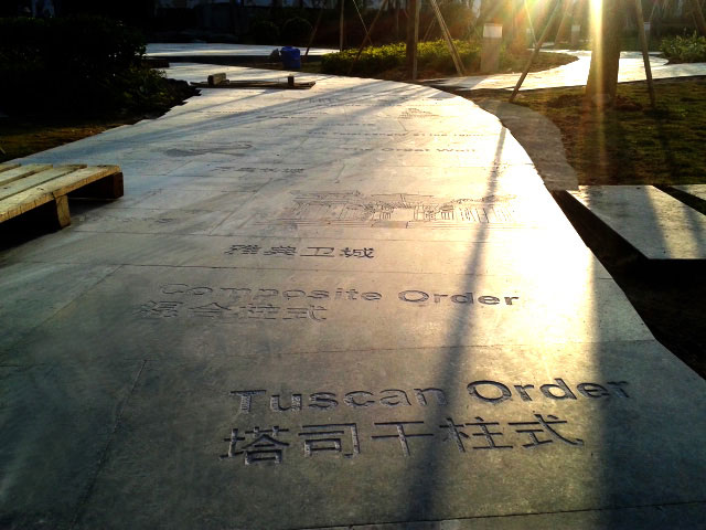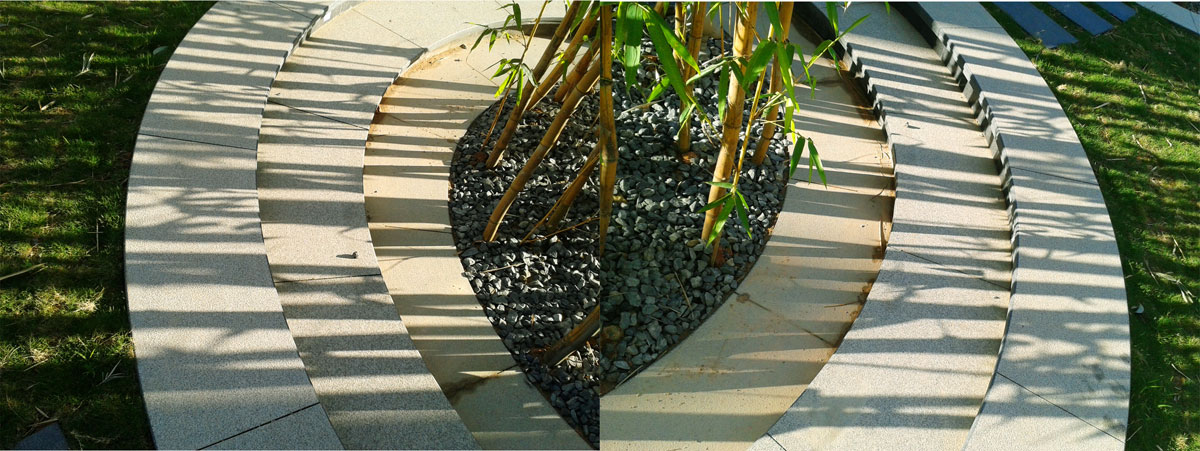 “主園路”——主路選用條形板巖,青色的銹板巖具有一種古典色彩,來自大山的石材,經(jīng)過加工,鋪成園林道路,“出于自然,回歸自然”。