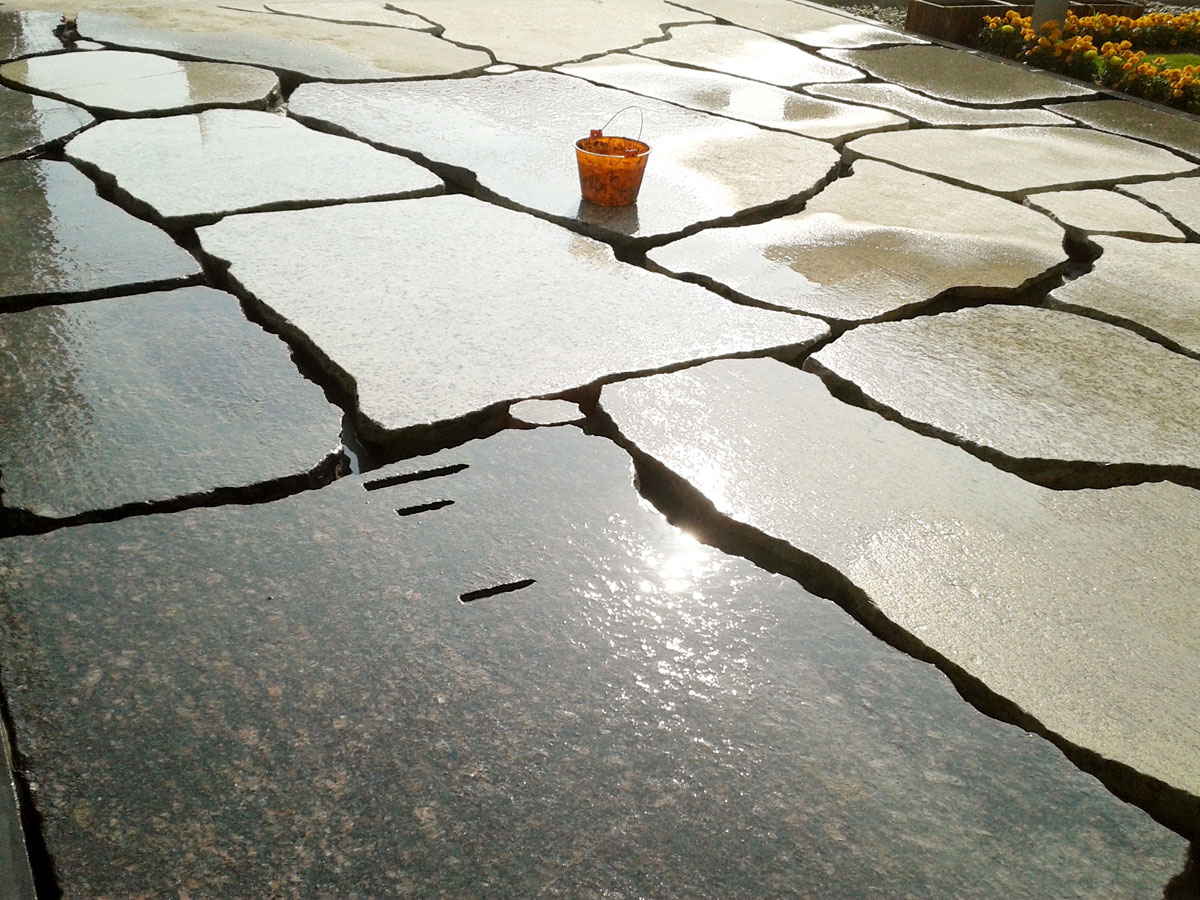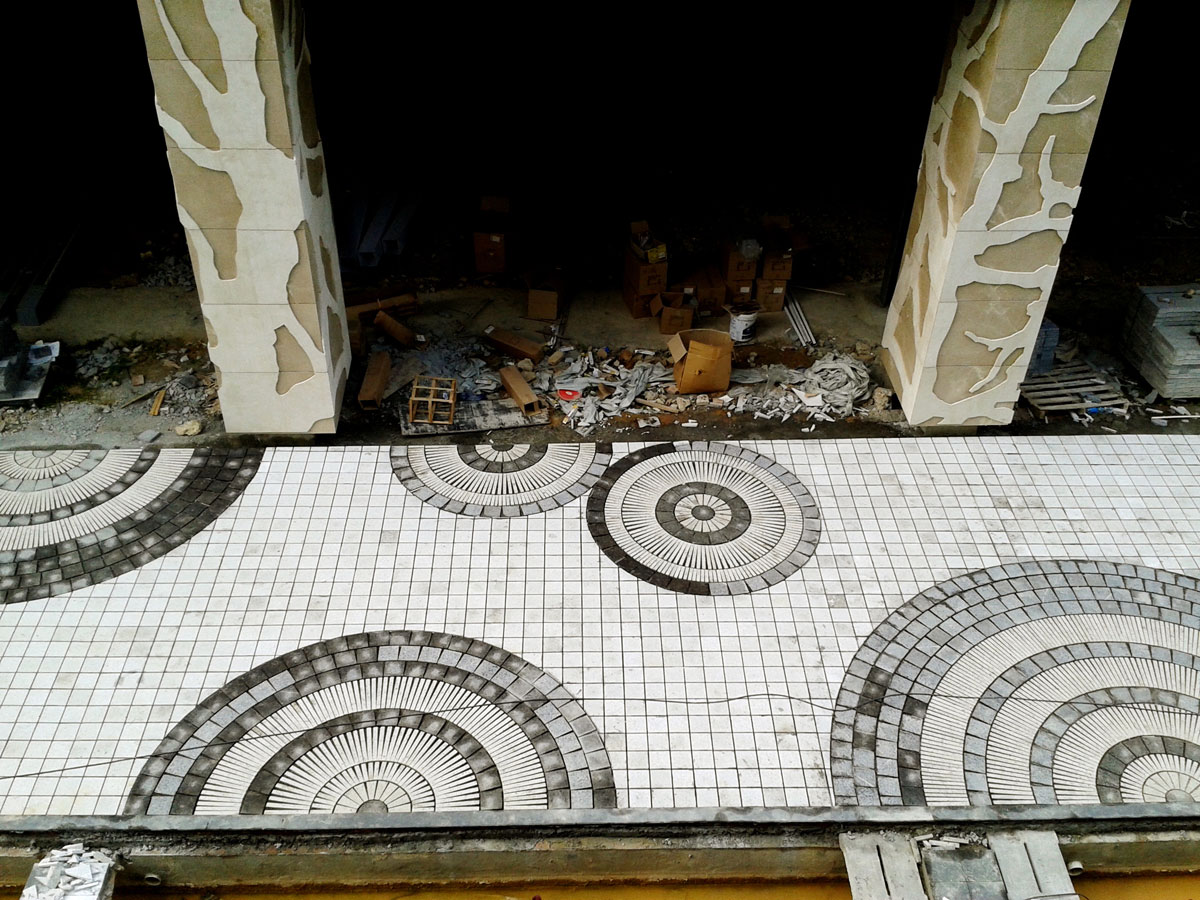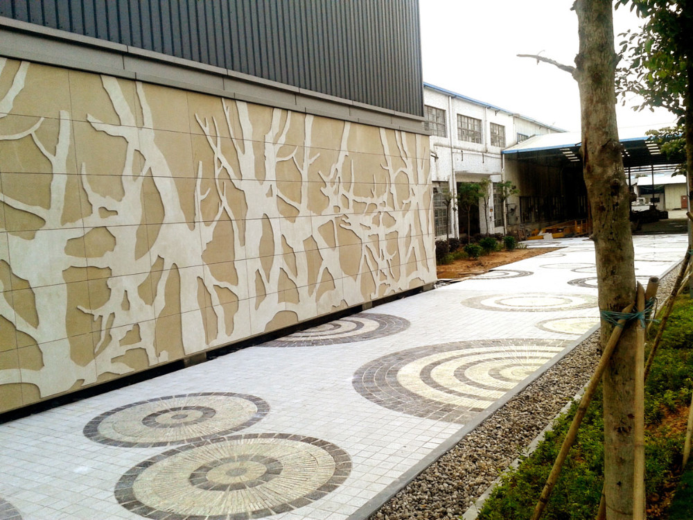 “水紋路面”——“上善若水,水善利萬物而不爭。”水乃萬物生長所需的重要元素之一,水的溫潤能夠柔化石材的冰冷和剛硬,而將一塊塊小石塊拼接成水波紋的形態(tài),這好比一個比喻,石材也有如水般溫柔的一面。大大小小的水波紋猶如雨水落入湖面瞬間泛起一層層的漣漪,變出千般美。