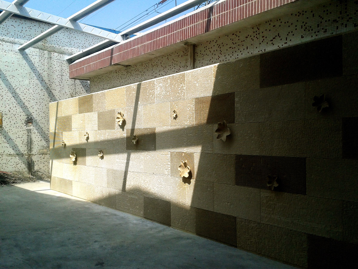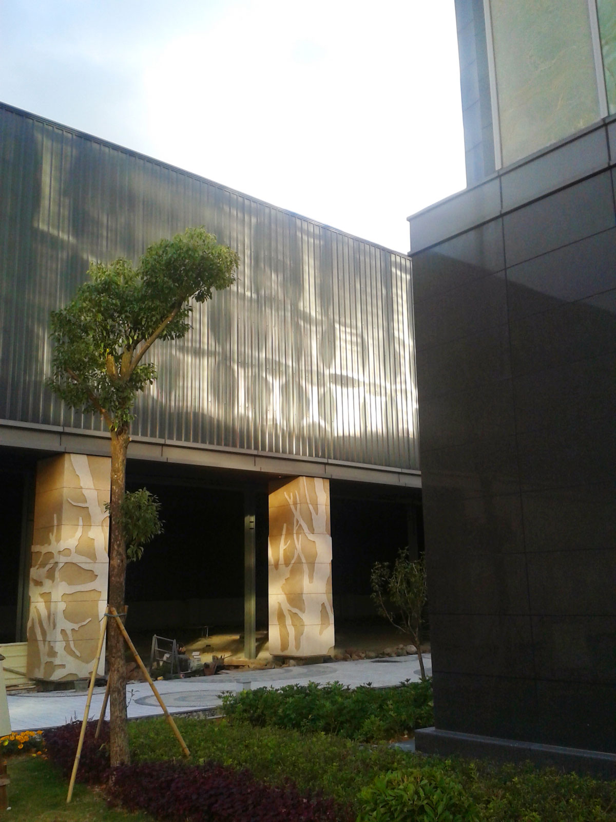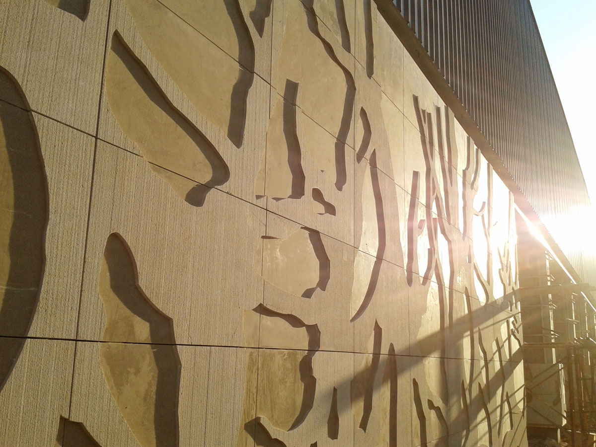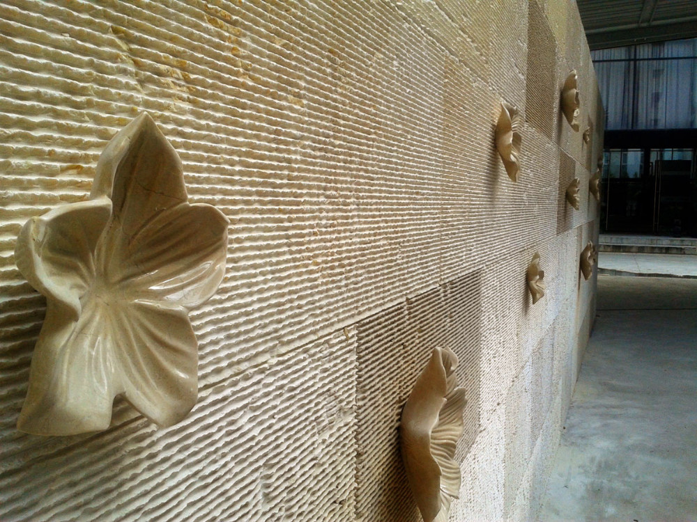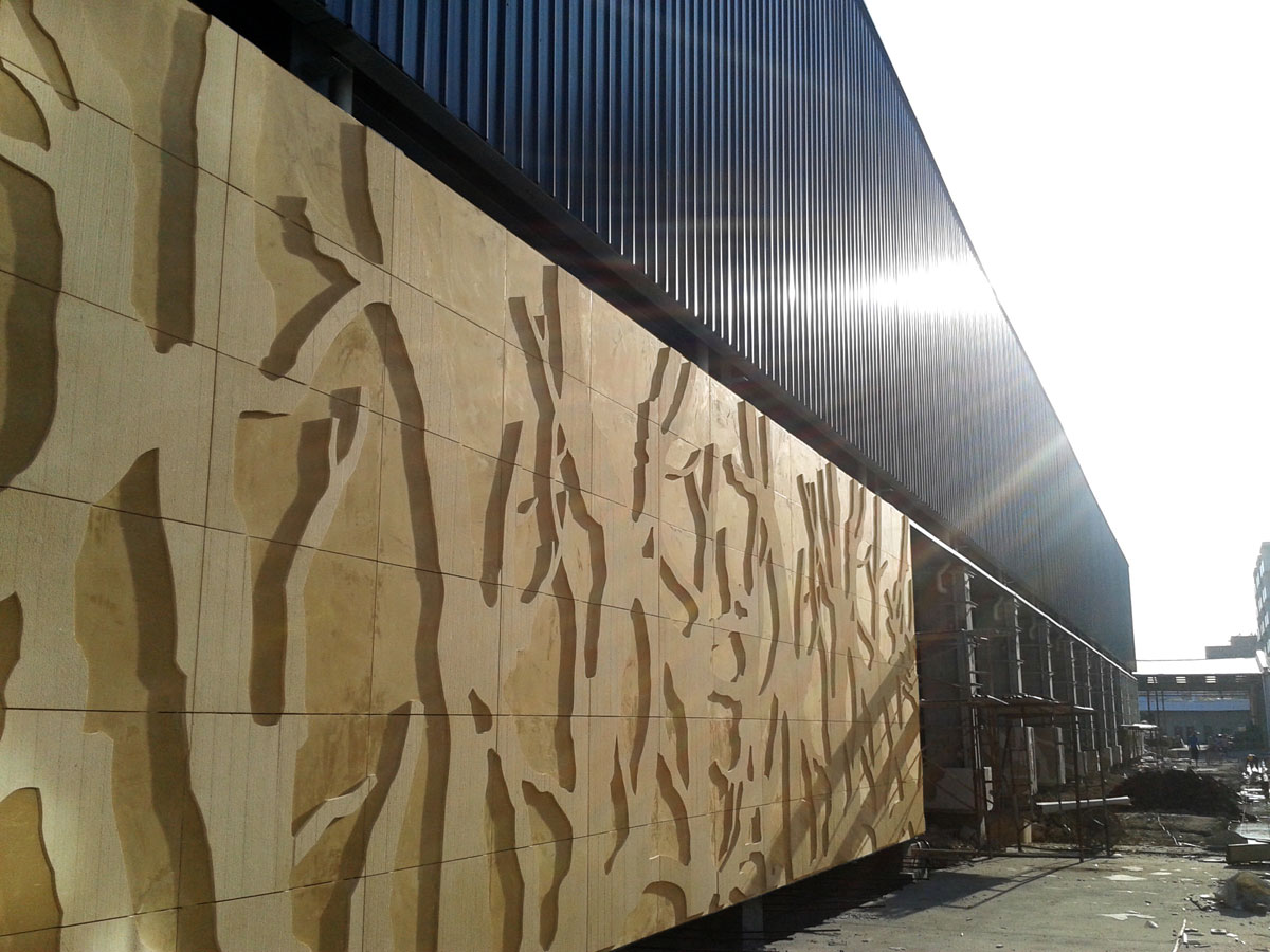 “樹影墻裙”——展廳外墻立面面積較大,設(shè)計(jì)以“樹林的剪影”為型,讓石材的硬朗頓時融化于疏影斑駁之中。遠(yuǎn)遠(yuǎn)觀之,叢林靜謐,詩意棲居,何等愜意!