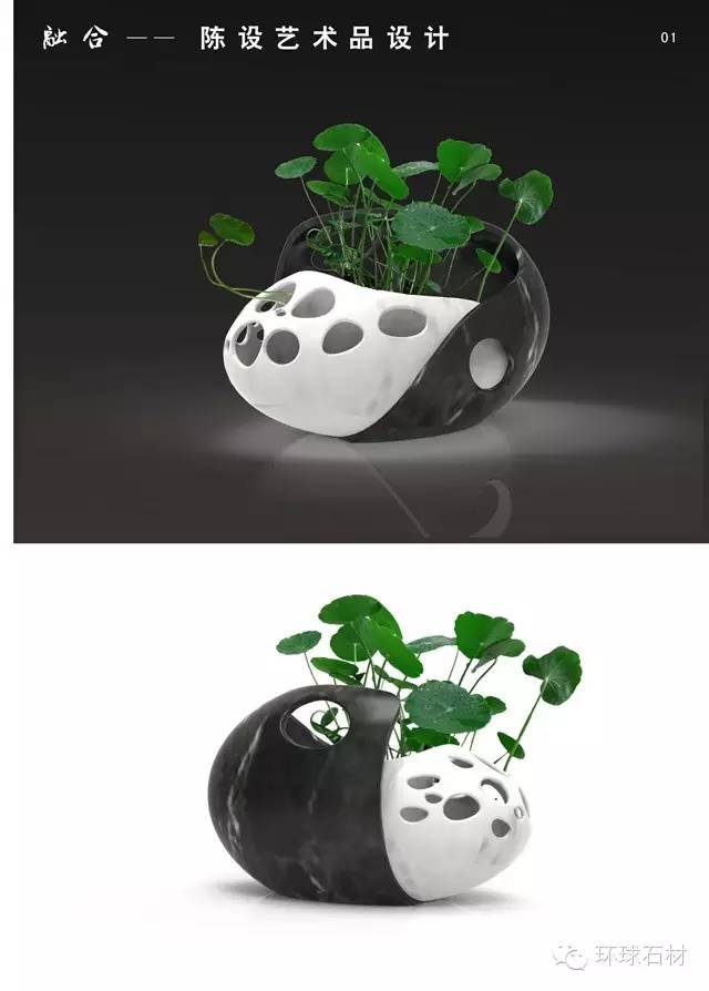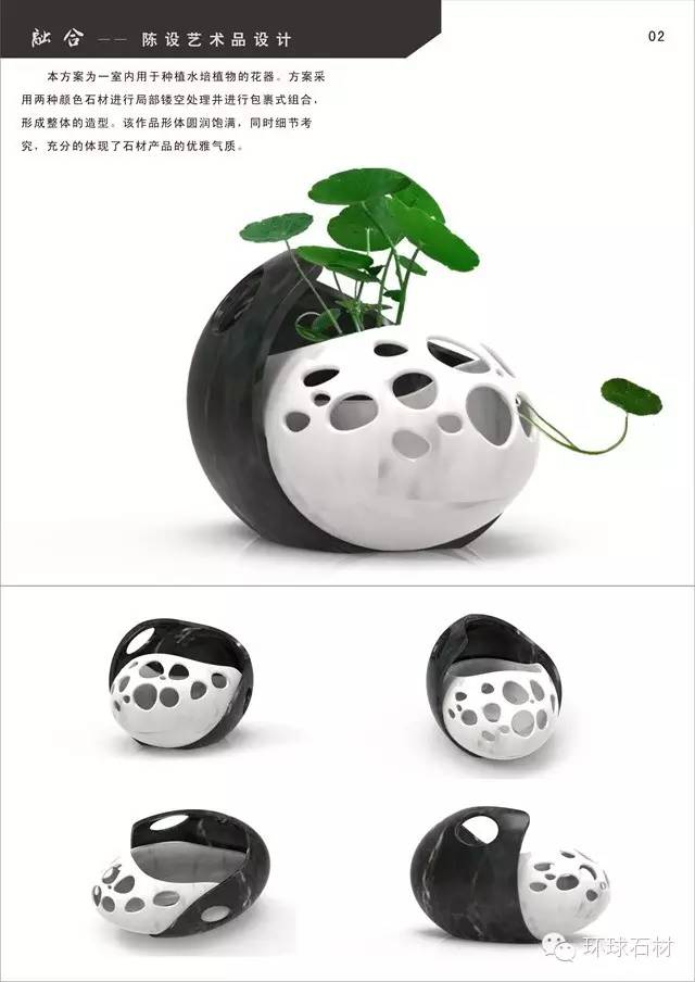 陳兆彩本方案為一室內用于種植水培植物的花器。方案采用兩種顏色石材進行局部鏤空處理并進行包裹式組合,形成整體的造型。該作品形體圓潤飽滿,同時細節考究,充分的體現了石材產品的優雅氣質。