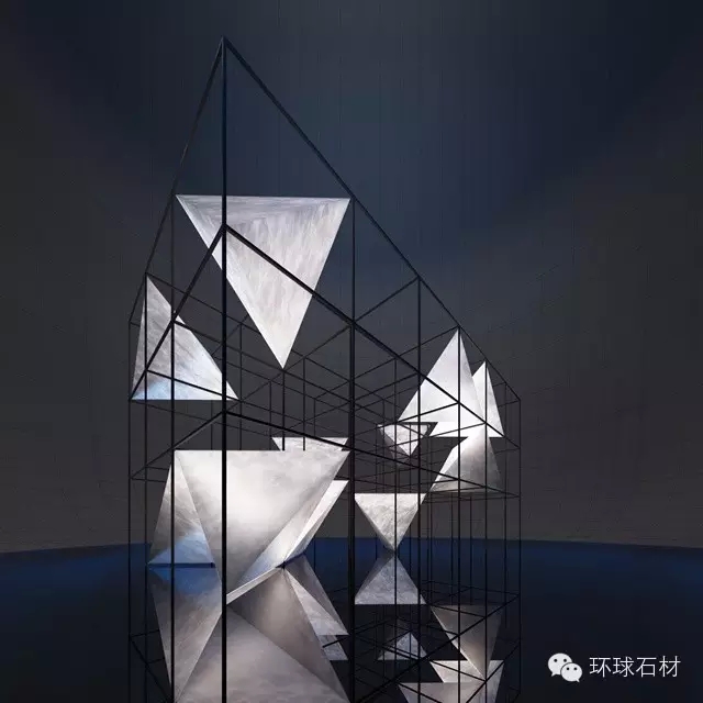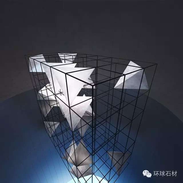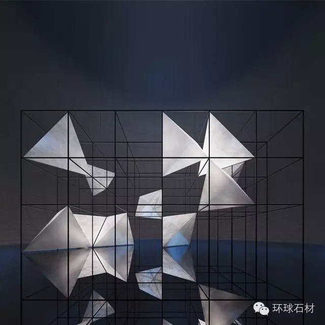 三維的世界是靜止的,當三維世界以時間為基點發生變化時,就形成四維空間; 在四維空間中,時間呈線性進行,雖然未來式的空間不可預測,但將來也只有一個,不管下一秒將站在哪個角度,即會產生不同的空間場景表情。人類可以想象出無限、永恒的概念,但是我們卻無法想到維度世界的形態和無法創造出一個永恒的事物。借助正方體四角連接形成的正三角體,以石材藝術為裁體,探討維次元的夢幻展示空間。