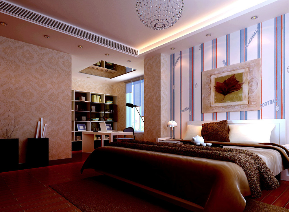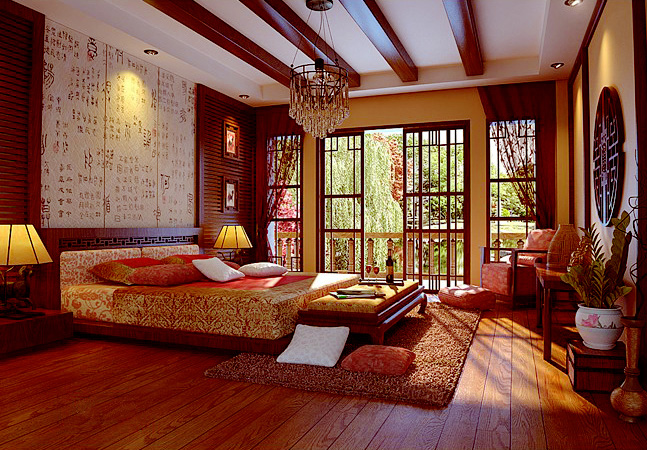 主臥的色調(diào)延續(xù)了客廳的配色,在沉穩(wěn)的基色中點(diǎn)綴了些許中國紅。“福”字的墻紙與木色的搭配更顯簡潔、舒適,而一系列富有東方色彩的家具飾品詮釋出空間的精神。