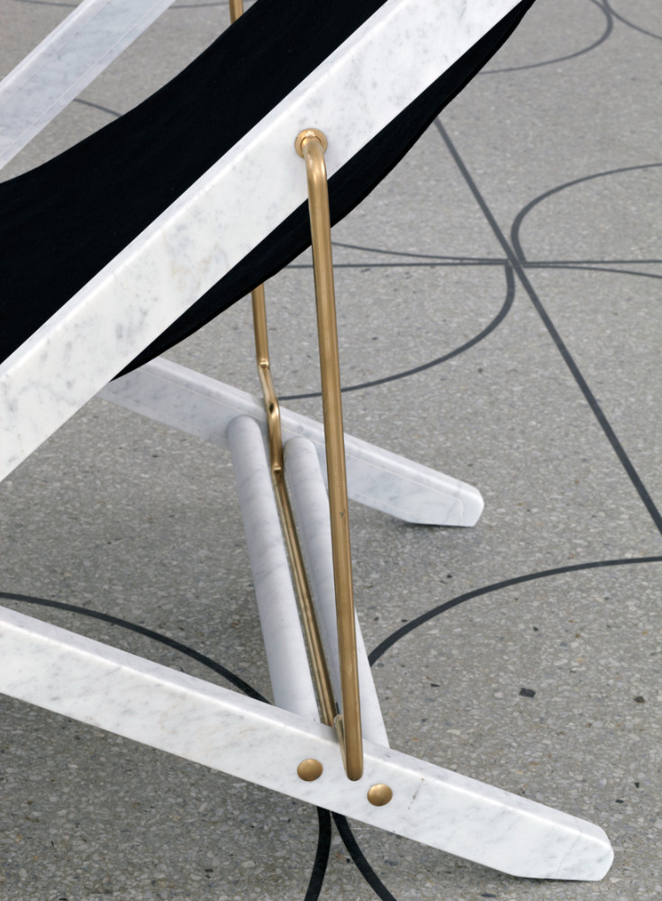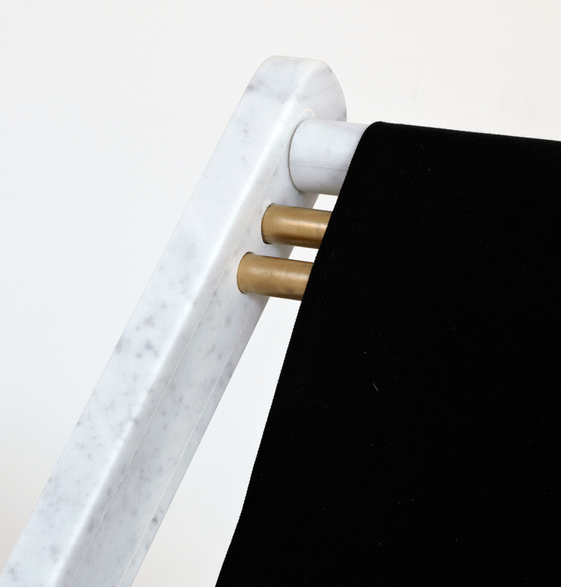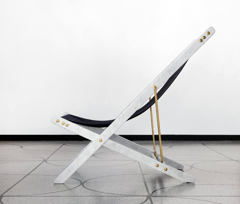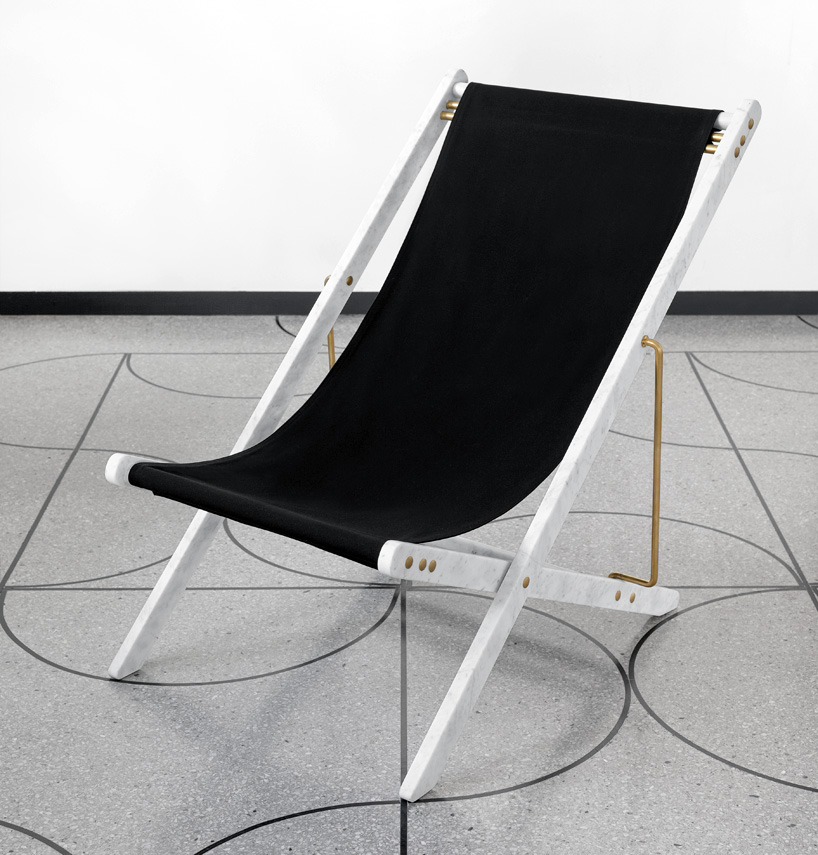camp design gallery近日與一系列設計師展開合作,推出一系列限量產品,要求設計師使用類似卡拉拉大理石和黏土等傳統材料,利用創新制造工藝設計出全新的作品。其中veronica todisco受邀設計一款現代家具,家具外形與生活中常見的物品相似,但卻使用突破常規的材料制作。最終她設計出一款名為“adaptations(改編)”的折疊帆布躺椅,與普通躺椅不同的是,這款躺椅的主體結構采用卡拉拉大理石制作,并用黃銅金屬框架支撐,外形十分別致。