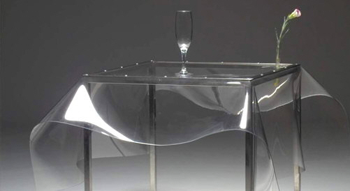 皇帝的新茶幾徹底通透的材料既是臺面也是臺布,割個十字口便可以方便地放入試管插花,配合冷硬的不銹鋼框架,制造一個強烈虛實對比。