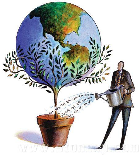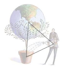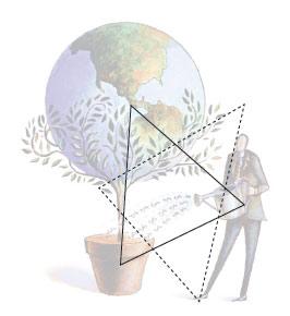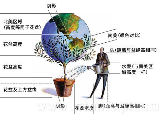 圖中三個主要部分——地球,花盆,人物——構成了一個三角形,三角形的中心也是個視覺上的焦點,就是美元符號的部分。