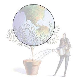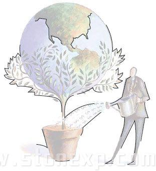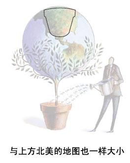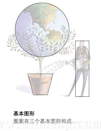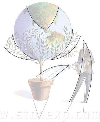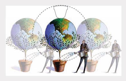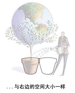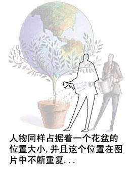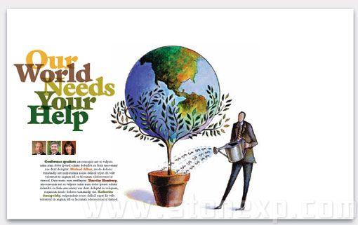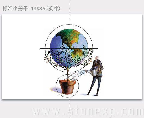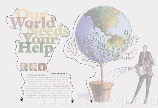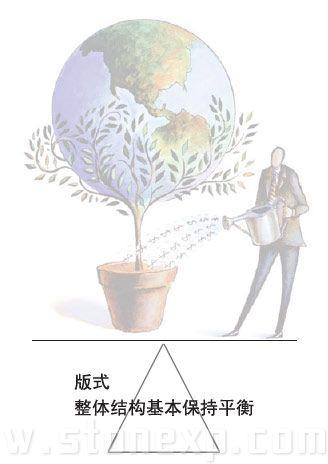 首先考慮的是圖形,到底應該把它放在哪兒,占多大的地方,這里關鍵是考慮視覺聯系。圖中的地球和花盆有很強的對稱關系,所以放在頁面正中央是最合適的,頁面中心是最能強化它們關系的位置。