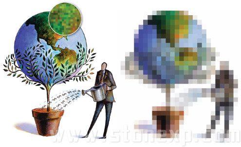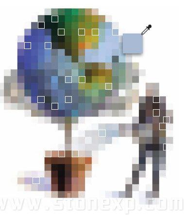 下面為這幅圖配一個背景色,可以從圖中選取合適的顏色。顏色在設計中占有很重要的地位,最方便也是最合適的顏色就在圖形本身,首先將圖形的分辨率降低,這個可以用photoshop中的馬賽克(Mosaic)濾鏡實現,一般有64色就可以,32色或是16色就更好了,降低分辨率,顏色就少了,增加分辨率,顏色就更豐富了。