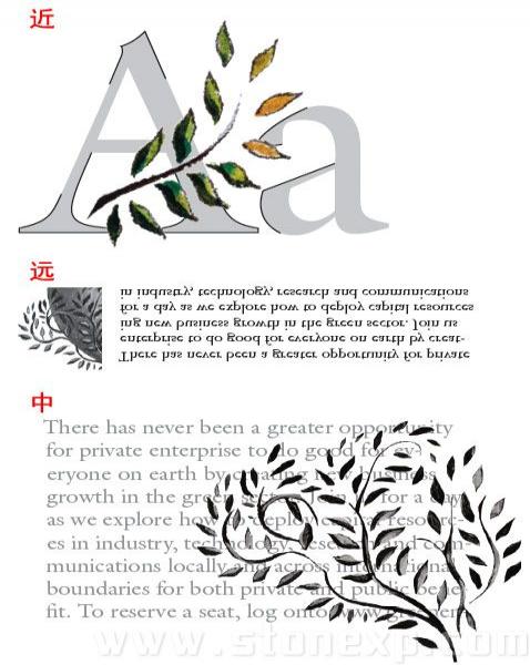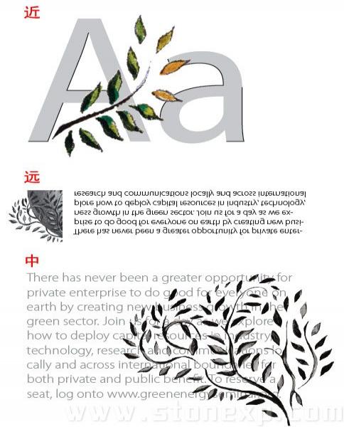 接下來我們需要選擇一種和圖形協調一致的字體。文字某種意義上也是圖形。選擇字體有很多種方法,你手頭上可能有很多字體,不需要怎么權衡,可能你腦子里已經有了某種概念,比如應該是正式的,商業的,或是學術的;也可能你有自己最喜歡的字體,每次應用效果都不錯。不管那種情況,一定要記住,文字同時也是一種圖案,文字的線條有直有彎,有鋸齒狀的或是顆粒狀的,當你在設計中加入文字的時候,它們會和原有的元素產生交互影響,可能是好的效果也可能變得更壞。在這個例子里,現有的圖形的特性決定了文字的選擇,要選取一種和圖形相似的文字,當然還要考慮文字本身的功能,比如要漂亮,易讀而且要適合復印。現在的圖形是什么樣的呢?它有很豐富的紋理,很多細節,還有樹葉的圖案是斑駁的,和襯線字體有幾分相似,讓我們看看三個不同類型字體效果怎么樣。