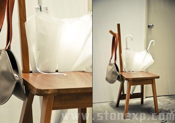 與普通的座椅相比較,它沒有靠背,取而代之的則是一個長方形的凹槽,這樣可是讓我們將雨傘插在里面,旁邊還有一個“Y”字行“樹桿”,您可以將包包或常見的衣服掛在上面,基本實現了衣架的所有功能。下面說說創意點:外出換鞋的時候,您不用再彎著腰穿些了,坐在這個座椅衣架上面,穿吧,雖然沒有沙發舒服,但很方便。穿好鞋之后,您在從衣架上面取下包包和外衣。