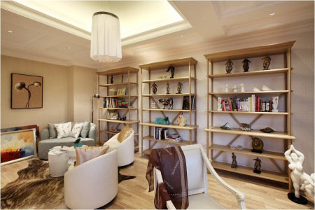 延著樓梯往上走就到了主人的臥室,即使是在這樣一個私密的空間里,也同樣可以享受到被自然撫摸的感覺。臥室以米白色為主色調,枝條狀的圖案在地毯上鋪開,靜靜地蔓延到衣柜和落地燈上,墻上一幅柔美的名家掛畫,靜默如花開。 一本小書、一個午后,當一米陽光從落地窗外不經意地闖入,舒服的光線讓心境如在水邊聽海般平和。臥室旁的寬大書房,打造成享受私人慢時光的藝術空間,簡單而富有設計感的沙發和幾臺組合成休閑的閱讀區,另一個角落的作畫區特別為女主人打造,手中的畫筆,耳邊的輕音樂,一切都自然而又隨心所欲。