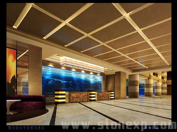 大堂作為客人進入酒店的第一公共區域,自然的也就會是對酒店產生第一印象。所以大堂空間,設計的好壞。直接地影響客人對酒店的評價。從入口開始設計了幾個親水區,而親水區一直貫穿了整個公共空間。在大堂的中心位置布設了大型魚缸景觀,與之連貫的是從天花到地面的一個藝術造型,加強了中心景觀的視覺沖擊力,地面反映地方特色文化的拼花和鑲人造寶石的欄河與海螺雕塑與之呼應。而構成一個特殊的文化空間。