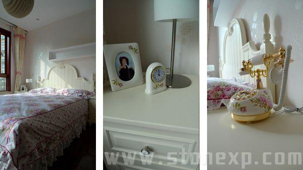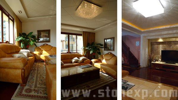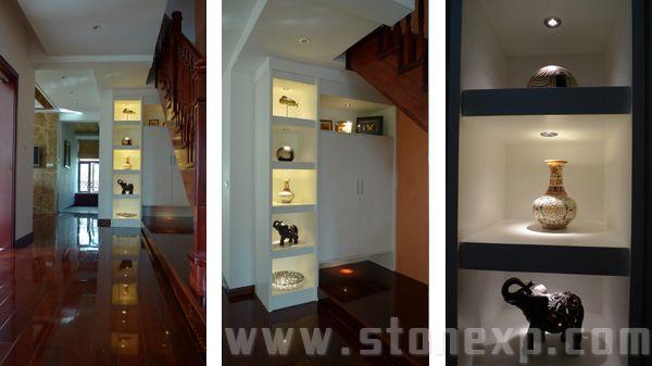 電視背景上方原來有樓上衛生間的下水管,背景這樣處理很好的掩蓋了管道,同時又比較大方。干掛的石材體現了品質生活的質感。頂面為石膏板抽45度V型槽處理,優雅漂亮!樓梯肚下的儲藏柜絲毫不顯得呆板,混水白色和兼做裝飾柜的處理,讓儲藏功能“一筆帶過”。
