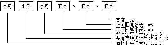 4.1.1 按所用石材種類分為大理石弧面板(代號為M)和花崗石弧面板(代號為G)。