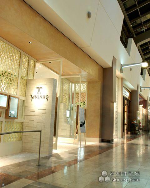 Tanishq零售店的大門前造型也頗具新意。巧妙的店內布局設計讓顧客可以自由選擇路線輕松的在店內欣賞珠寶。店內的亮點便是綠色植物的點綴,它們從白色房頂沿著陶瓦色墻壁延伸,將墻壁分割著不同的區域。