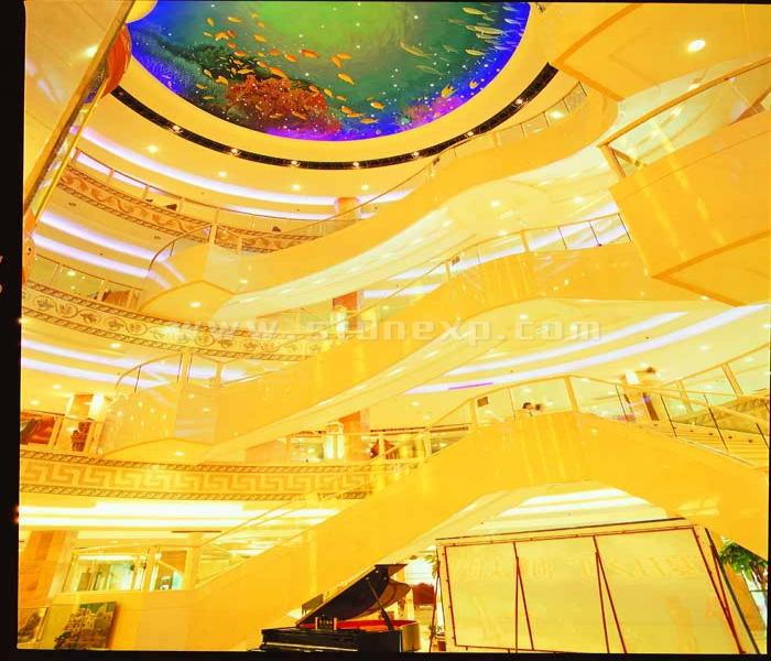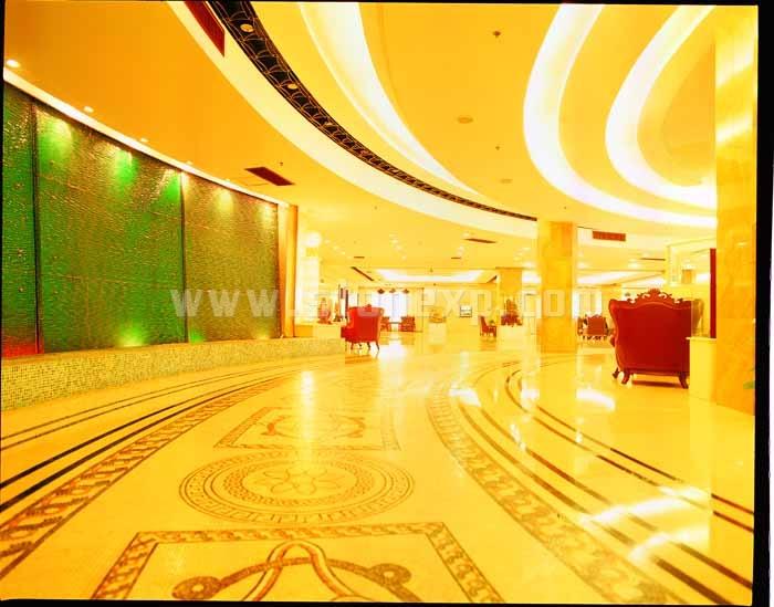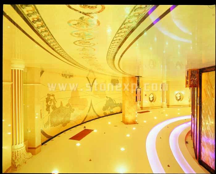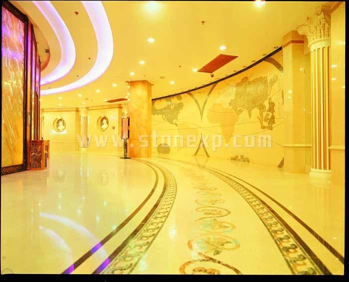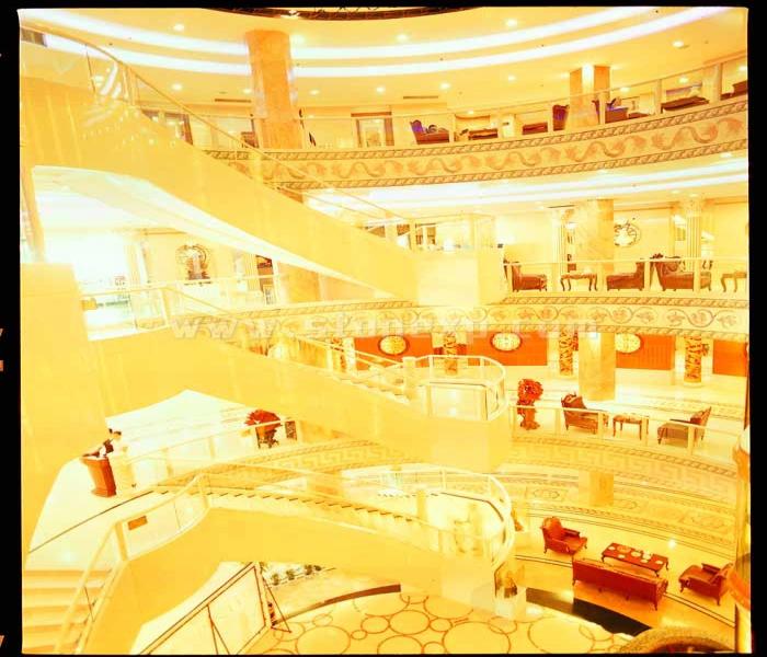 要表現的主題:富麗堂皇,中外相結合風格;要表現的石材質感(要素):明暢、簡潔、古樸有質感;可以體現工藝難度的地方:旋轉樓梯、扭紋柱、地毯拼花;石材總體色調:米黃色(用料莎安娜米黃、馬賽克)