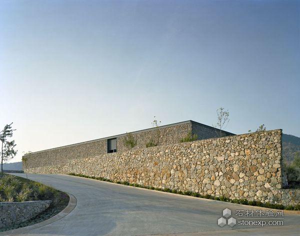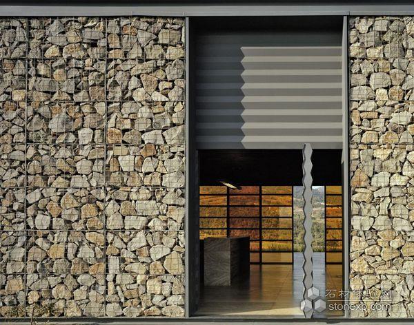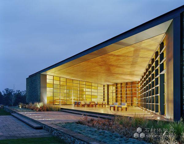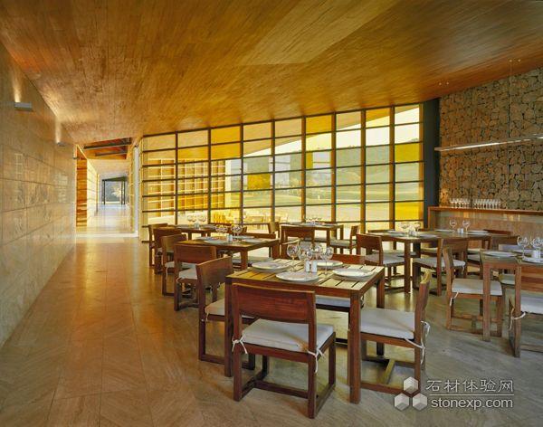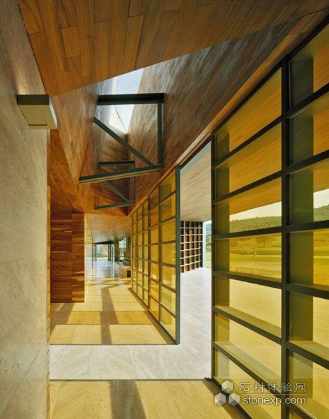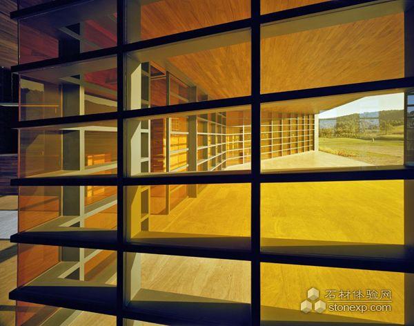 琥珀色的光線透過(guò)窗戶上手工加工過(guò)的玻璃制造出一片色澤豐富的空間,使人在白天不知不覺中沐浴了好幾種顏色,橘黃色,紅色,黃色。光線同時(shí)從房屋中間的兩個(gè)木質(zhì)天窗投進(jìn)來(lái),幫助調(diào)和從窗戶進(jìn)來(lái)的被染過(guò)的光現(xiàn)。外墻大量采用了石材是整個(gè)建筑有一種厚重感。