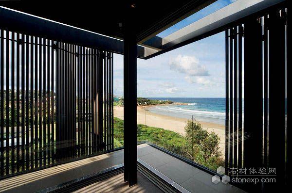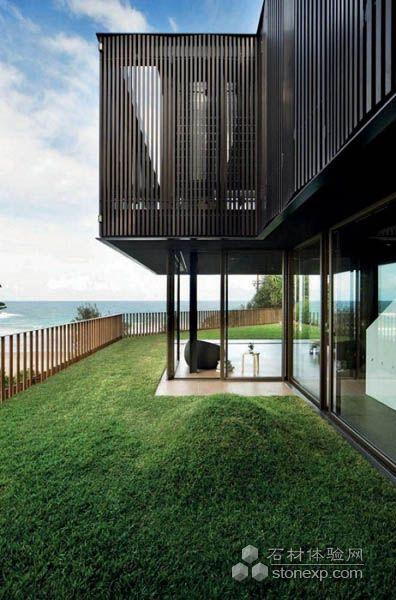 建筑由三個獨立部分組成,一個地下室,一個花園/生活空間,和一間臥室,臥室被可開啟的百葉幕墻包圍。每個部分具有獨特的空間和材質。地下室內向封閉,利用基地自然地形隱藏凹入口和車庫。二樓包裹著豎向的木百葉,并延伸到一層,成為基地周圍的欄桿。豎向的木百葉欄桿與建筑有一定的角度以便看見沙灘。整個建筑極具線條感,采用木材,復合材料和天然石材。