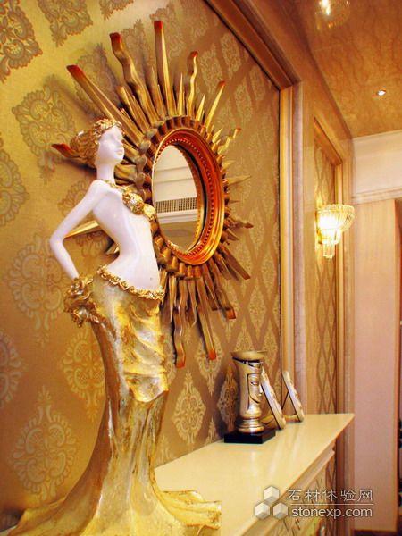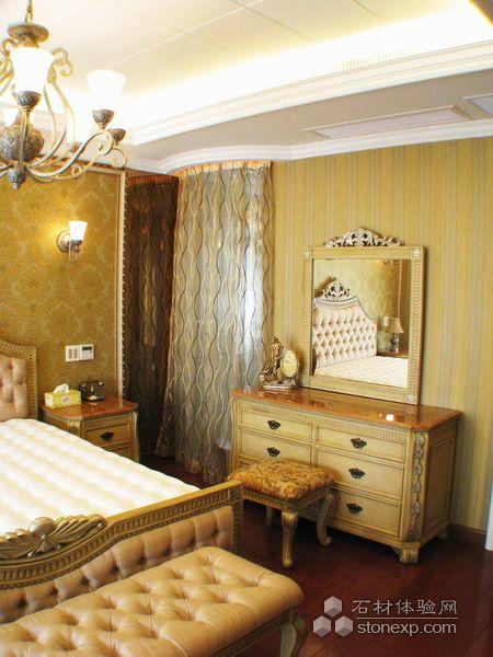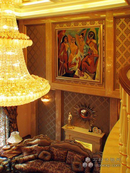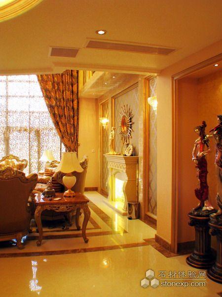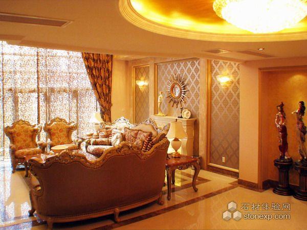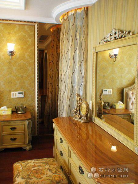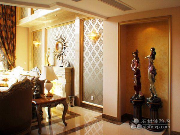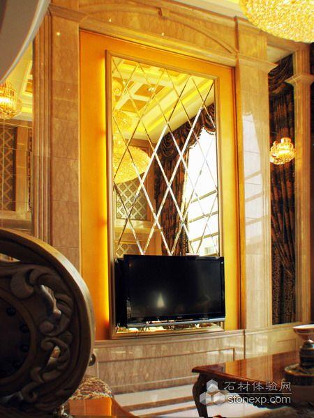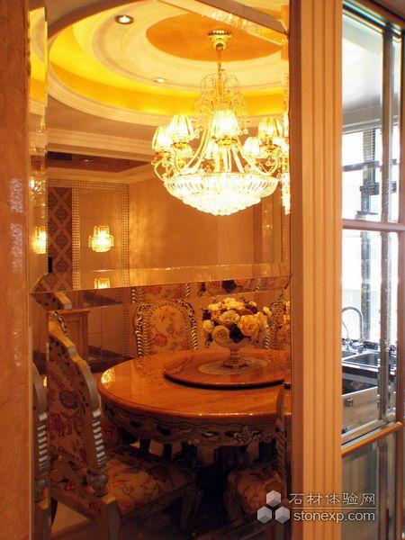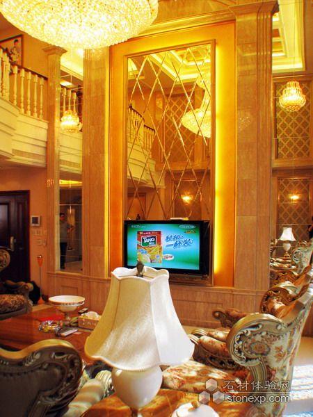 客廳的設計,本身空間是調空空間,最大限度的發揮空間所長處各個面的處理,為了在加大空間感拓寬的視野采用的一些金鏡和銀鏡的運用,讓其在結合石材的大氣,顯得整個空間舒適華麗。另一方面家居來講也是至關重要的是溫馨,為了居住環境得到溫馨而采用溫馨暖色調的壁紙來覆蓋整個環境氛圍,局部點綴形式的花紋壁紙運用是為了點出層次及立體和活躍的空間感。