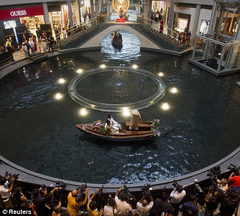 一對新婚夫婦正在濱海灣金沙酒店購物中心的室內(nèi)運河上泛舟