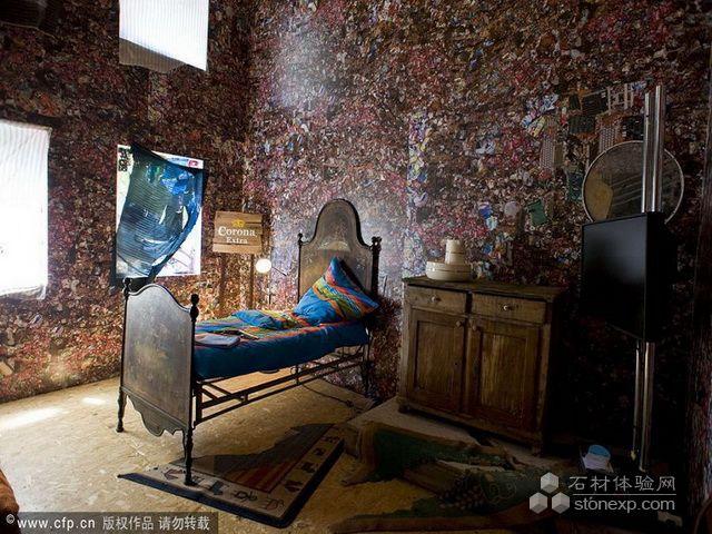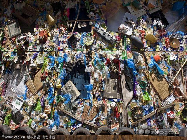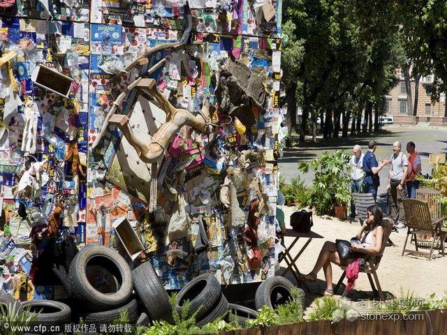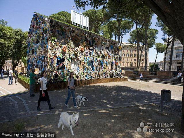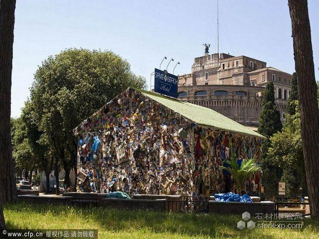 2010年6月5日,意大利羅馬,“拯救海灘”酒店現身圣天使城堡花園。這是第一家用垃圾建造的酒店,由德國建筑設計師HaSchultz利用從歐洲海灘上收集到的12噸無機垃圾建成。