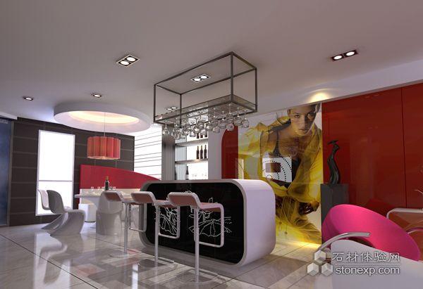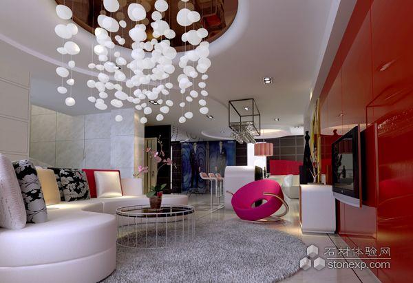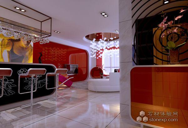 流線布局是本案的特點,使空間變的有趣而不死板,在視覺上變得豐富而又動感,色彩上主要以紅、白、輔以深色調和,充分彰顯的活力,流線的布局和結構形體也使整個空間充滿動感,在功能細節上也考慮的很細致,如皮面的軟包的飄窗,可移動的茶幾,把飄窗部份變成了一個舒適度很高的休閑及景觀區域。吧臺后的和移門即作為背景又將睡眠區和客廳分隔隱藏起來,使兩個不同的功能空間互不相擾,保持各個空間的獨立性和視覺上的完整性。