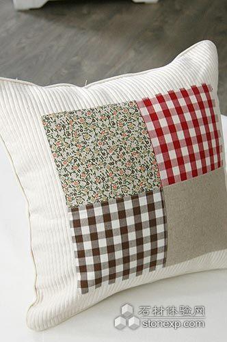 用四塊不同圖案的碎花、條紋拼布,搭配出大面積的四格圖案,讓靠墊的正面充滿田園的質樸和溫馨。純樸的碎花和格紋帶著獨特的鄉村感覺,不會破壞田園風格的自然味。