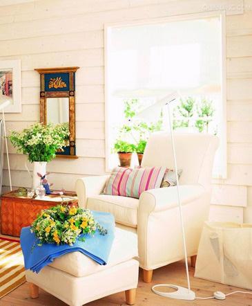寬大的窗戶射進明亮的陽光,讓白色在整個空間中充分展示出了它的純凈和清爽。綠色的植物和可愛的小花也可以在這份親切的陽光中自在的呼吸。沒有人會不愛這樣的角落。線條簡潔的白色沙發在鮮艷靠墊的點綴下,在純美中營造出一絲活躍的氣氛。