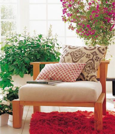 造型簡單的休閑椅流露出的是與自然合一的隨性,同樣充分運用了白色窗欞引進充足的光線。椅子周圍環繞花花綠綠的植物,自然的氣味能讓人沉醉。而出挑的紅色毛絨地毯讓人有一種“萬綠叢中一片紅”的奇妙感。大大的靠墊增強了舒適性。
