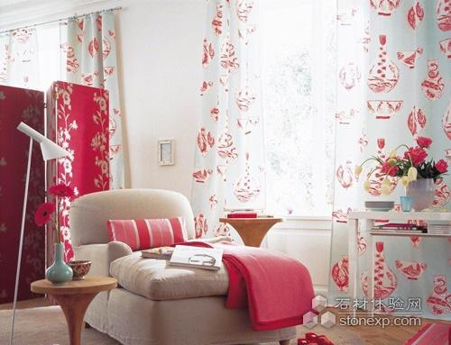 大量紅色的圖案搭配淺藍的底色,這種紗簾本身就夠有個性了,營造出空間出挑的色彩感,而核心的地方采用了保險的中性色彩。加長的沙發呈現出休閑舒適,搭配格式的紅色裝飾,讓裸色不顯枯燥。其中紅色的花朵為空間增添了激情和女性的魅力。