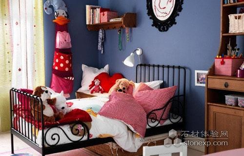 雅致的深藍色背景墻,沒有表現出明亮的色澤,而是用低飽和度的色彩裝飾,更顯出臥室的素雅,也給人清涼的舒適感。各種可愛的玩具以及收納擺設,讓臥室空間生動活潑。