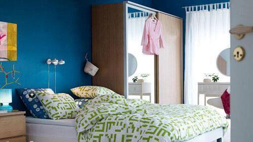 藍綠色的臥室空間,白色家具在藍色背景墻的襯托下,更加清爽簡潔。墻壁上巧妙的收納區域設計,讓臥室空間變得更加有趣。青花瓷的藝術花瓶擺放,更有一種透心的清爽感受。