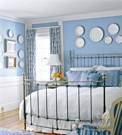 藍白色調浪漫而沉靜,淺藍色背景墻的清透與白色圓盤裝飾的安靜相互映襯,有著海一般的夢幻感覺,優雅的配色似如歌的行板,浪漫溫馨,裝點出如水一般純凈又內涵豐富的臥室氛圍。