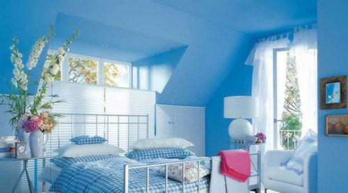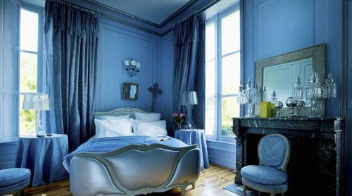 整個臥室空間都是用藍色打造出來的,藍色的背景墻搭配木質地板的顏色,讓空間更加清爽自然。精致的裝飾和完美的細節讓房間典雅舒適。