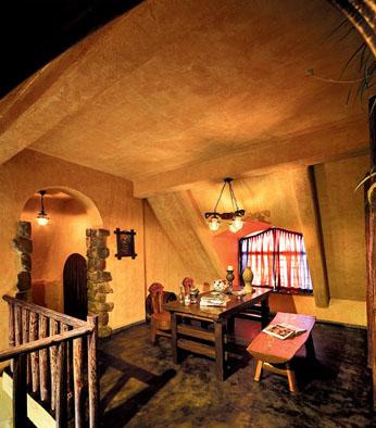 女主人從事的也是建筑行業(yè),喜歡各種各樣的瓷器,也喜歡豐富的色彩,而色彩是裝飾的中心,她和設計師不約而同地選擇了淡淡的橘黃色作為墻壁的顏色,這正好符合摩洛哥人擅長用當地的土色色調設計比較柔和的環(huán)境的特點。這種柔和的色調使房間顯得非常溫暖,再加上特殊的紋理處理,使墻面很斑駁,有年代的久遠感。而整個一樓的地板都是用水泥來鋪的,同樣做了特殊的紋理處理,不僅節(jié)約了地板的制作成本,同時也與墻面的感覺一致。將門廳的形狀設計成山洞形,甚至連樓梯也略帶彎曲,蜿蜒而上,這些都是設計師和女主人經過仔細商量后的結果,這些不規(guī)則的形狀使得整個房子在質樸的泥土色調中多了幾分活潑,同時也符合摩洛哥人沙漠居住的特點,自然而真實。