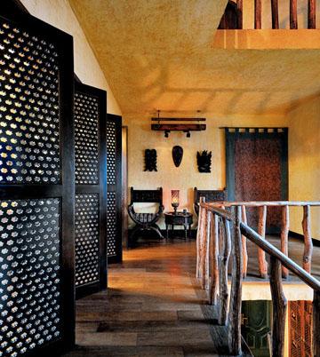 摩洛哥風格中最為傳統的鏤花板被用在了二樓的書房,既是旋轉的門,也是隔扇。從鏤花板投射的光線及暗影極富戲劇性,大自然的光穿過鏤花板,在過道的墻上形成生動的圖景。鏤花板不僅保持室內涼爽,而且鏤刻出的圖案經光線照射、投影,產生神奇的裝飾效果。